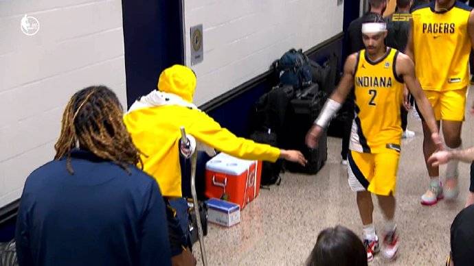 赛后,步行者返回更衣室的通道内,开场遭遇重伤的泰瑞斯-哈里伯顿拄着拐杖等待每一位队员,一一击掌拥抱。这一幕,实在太过令人心痛。